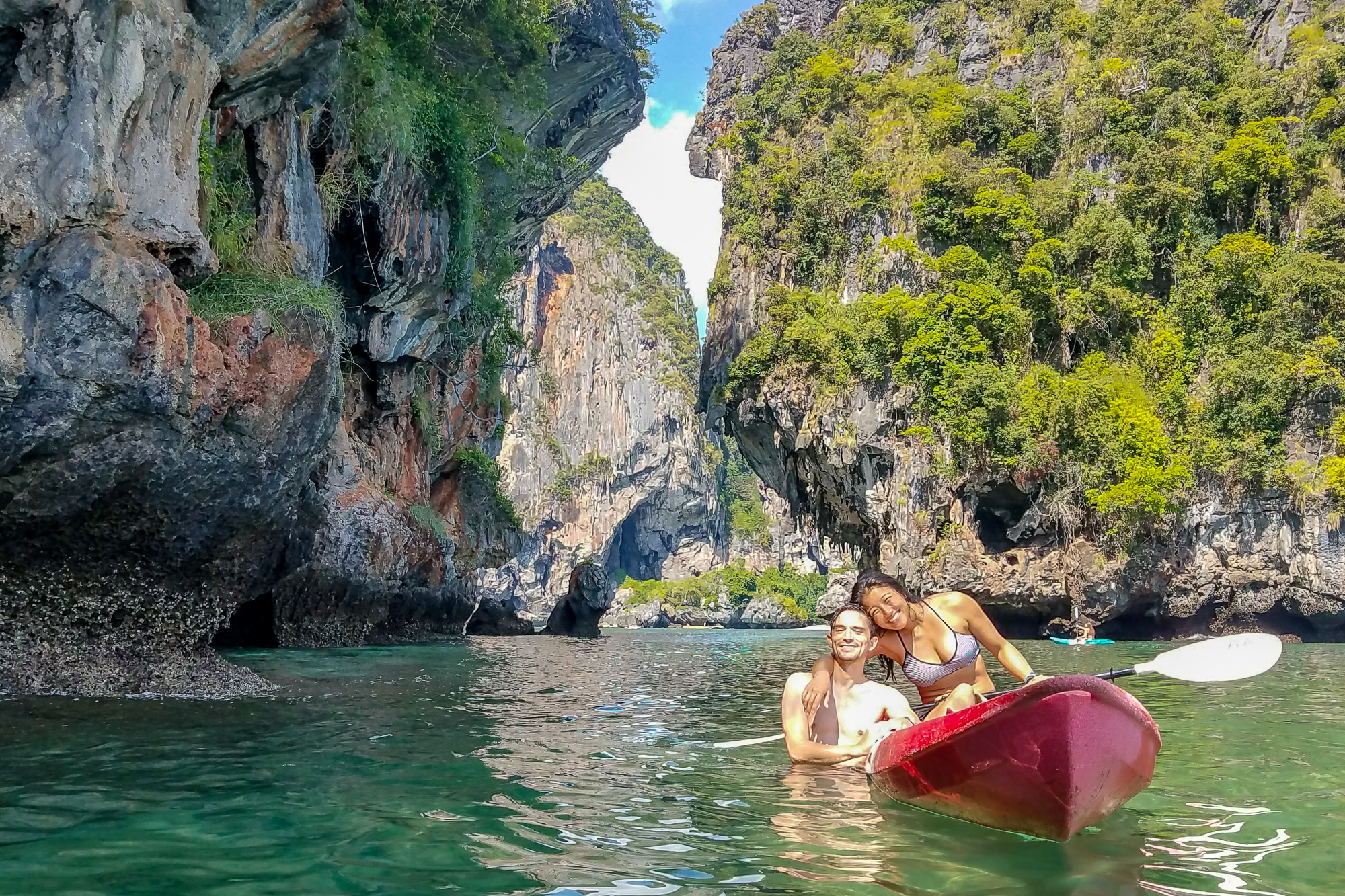 Our first climbs were on the beach, belaying with our toes in the sand. Whenever we turned, we were met with gorgeous views of the bay. We exchanged conspiratorial grins – this week was going to be awesome!On our second morning we climbed Humanality (6b+), a four pitch route at the eastern end of Tonsai beach. One move had us leaning over on to a massive tufa with nothing but air for 200 feet below! After enjoying the view at the top of the climb, we rappelled directly into the beach bar. That afternoon, we hiked to the decidedly more posh Railay, and continued through the jungle in search of a secret wall accessed by climbing through a canyon and rappelling down. By chance we recognized some rad Canadian friends from Green Climbers Home. The next day they joined us as we climbed/caved through a mountain to access one of the most beautiful climbing lines I’ve ever seen. It was so amazing that I did the climb twice, leading it clean from bottom to top on the second go.